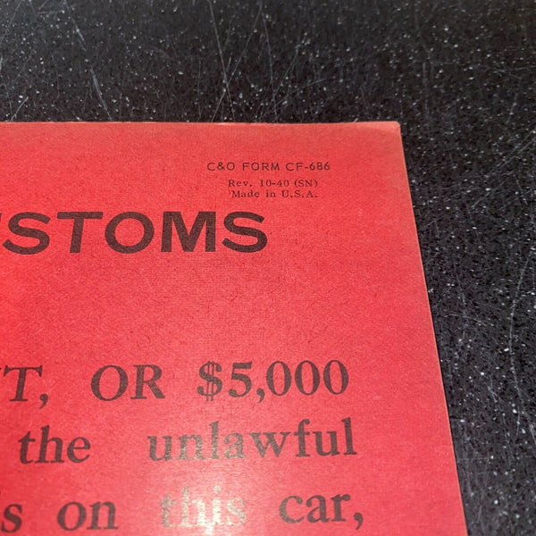 United States Customs New Car Vintage Sign 1940 Red Cardstock